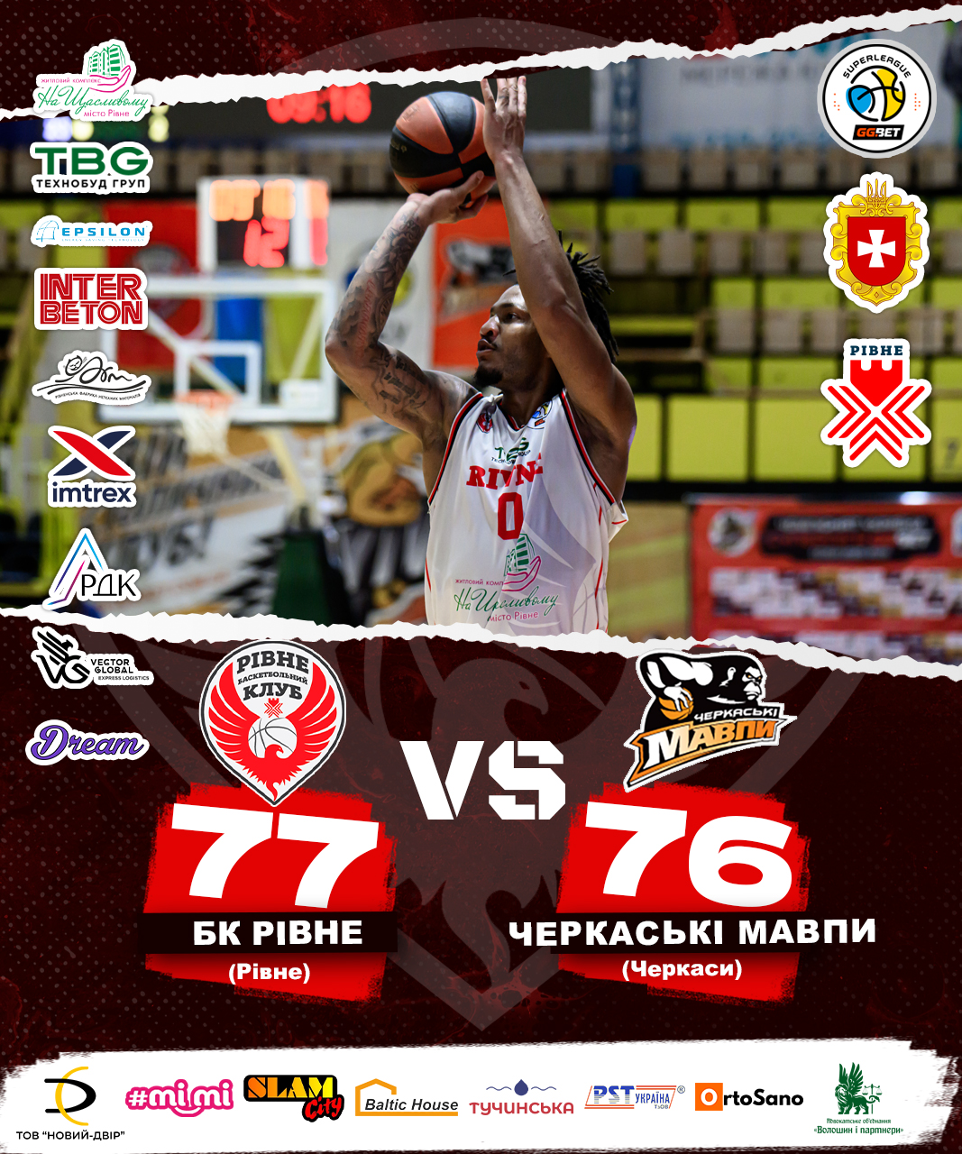 БК Рівне у драматичному матчі в Києві здобув важливу перемогу над Черкаськими Мавпами — 77:76 ОТ. Поєдинок у ПС «Венето» тримав у напрузі всі 45 хвилин. Команди по черзі виходили вперед, а максимальна перевага у грі становила лише 11 очок. Основний час не визначив переможця, тож доля матчу вирішувалася в овертаймі, де рівняни проявили характер і дотиснули суперника.